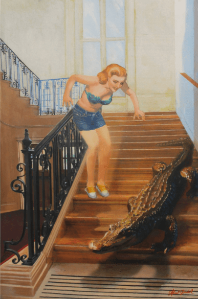 In a Floridian home, a familiar visitor, an alligator lingers at the stairs. But this is no cause for alarm.A housewife, unfazed and composed, ushers the reptile away with practiced ease. There is no fear in her eyes—only the quiet assurance of someone well-versed in the peculiar rhythms of life in Florida.The alligator, docile and obedient, glides down step by step, its scales catching the warm glow of the afternoon sun filtering through the windows. It neither resists nor threatens; it simply follows, an uninvited but not unfamiliar guest retreating to the wild.For the housewife, this is just another moment in the everyday tapestry of Floridian life—where the boundary between civilization and wilderness is thin, and encounters with nature are as ordinary as the rustling of palm fronds in the breeze.