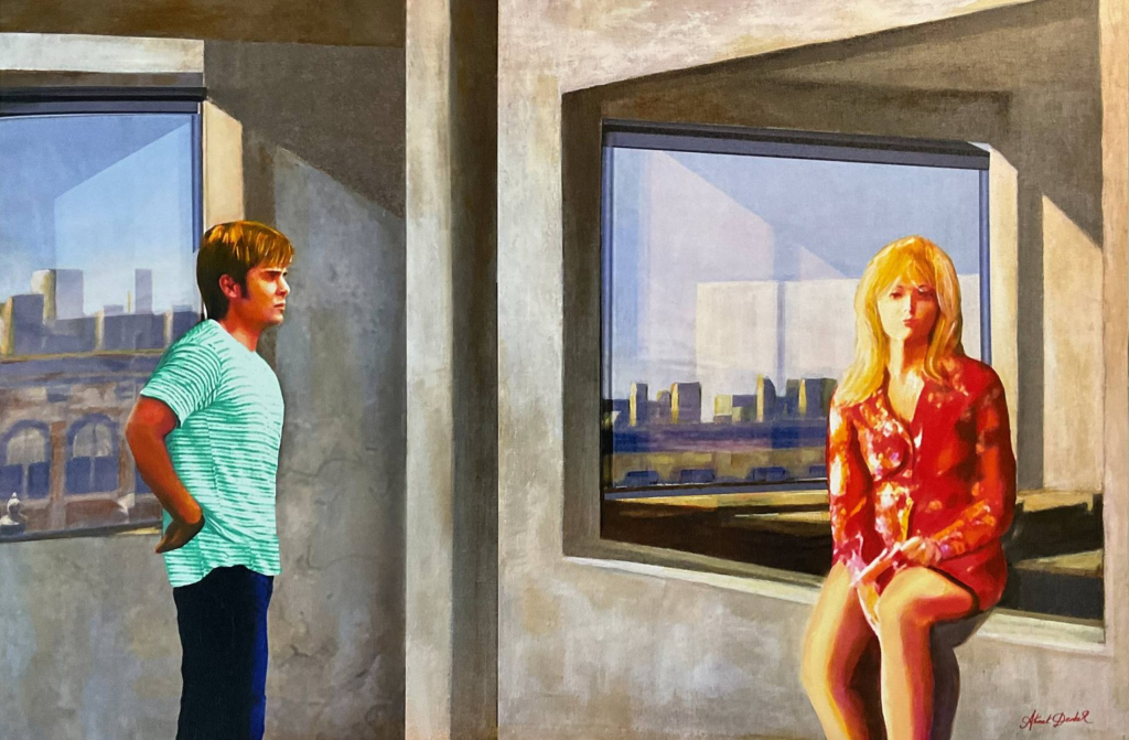 In this painting, I have tried to depict the sorrow of a broken heart as reflected in the eyes of the protagonists. The Edward Hopper-esque background suggests that the venue is an office in New York. A blonde woman sitting in the partition between two rooms holds a torn envelope in her hand. Obviously, it was what came out of this envelope that caused her heart to break. The young man in the other room looks at her heartily with the pain and silence of the broken relationship.