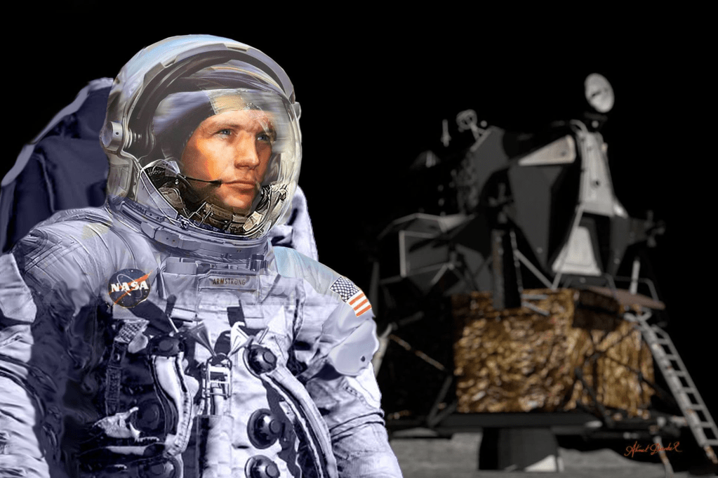 In the deep, silent expanse of the cosmos, where the starry canvas of space stretched infinitely, a monumental chapter in human history was written. The year was 1969, and the mission was Apollo 11. The destination: our celestial neighbor, the Moon. In the heart of this remarkable journey, we find ourselves on the lunar surface, surrounded by the inky void of space. Before us, bathed in the ethereal glow of Earth’s reflected light, stands a solitary figure – the intrepid Neil Armstrong, the first man to walk on the Moon. His iconic, glittering space suit glistens in the lunar illumination, a testament to both human ingenuity and boundless curiosity. Behind him, the blurred image of the lunar module, the “Eagle,” takes shape. This miraculous machine carried the dreams and aspirations of millions, gracefully touching down on the Moon’s desolate, yet enchanting landscape. Its blurred contours hint at the magnitude of this momentous occasion, a silhouette of human ambition and exploration.