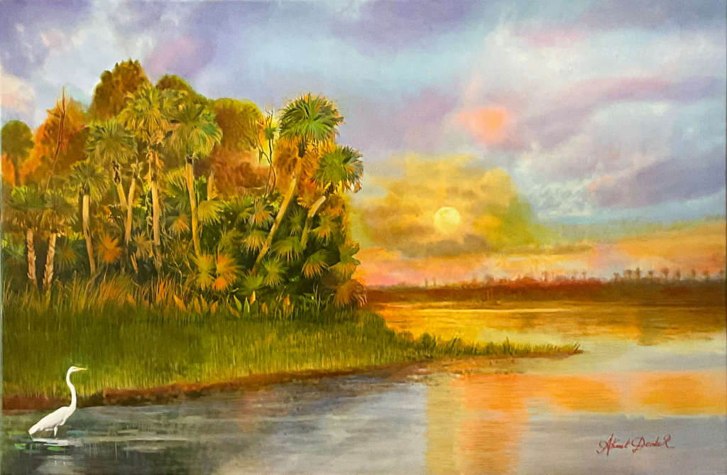 The beauty of Florida landscape, tropical light and the allure of great white egret are the inspirational sources of this painting. I wanted to bring them together in a frame.